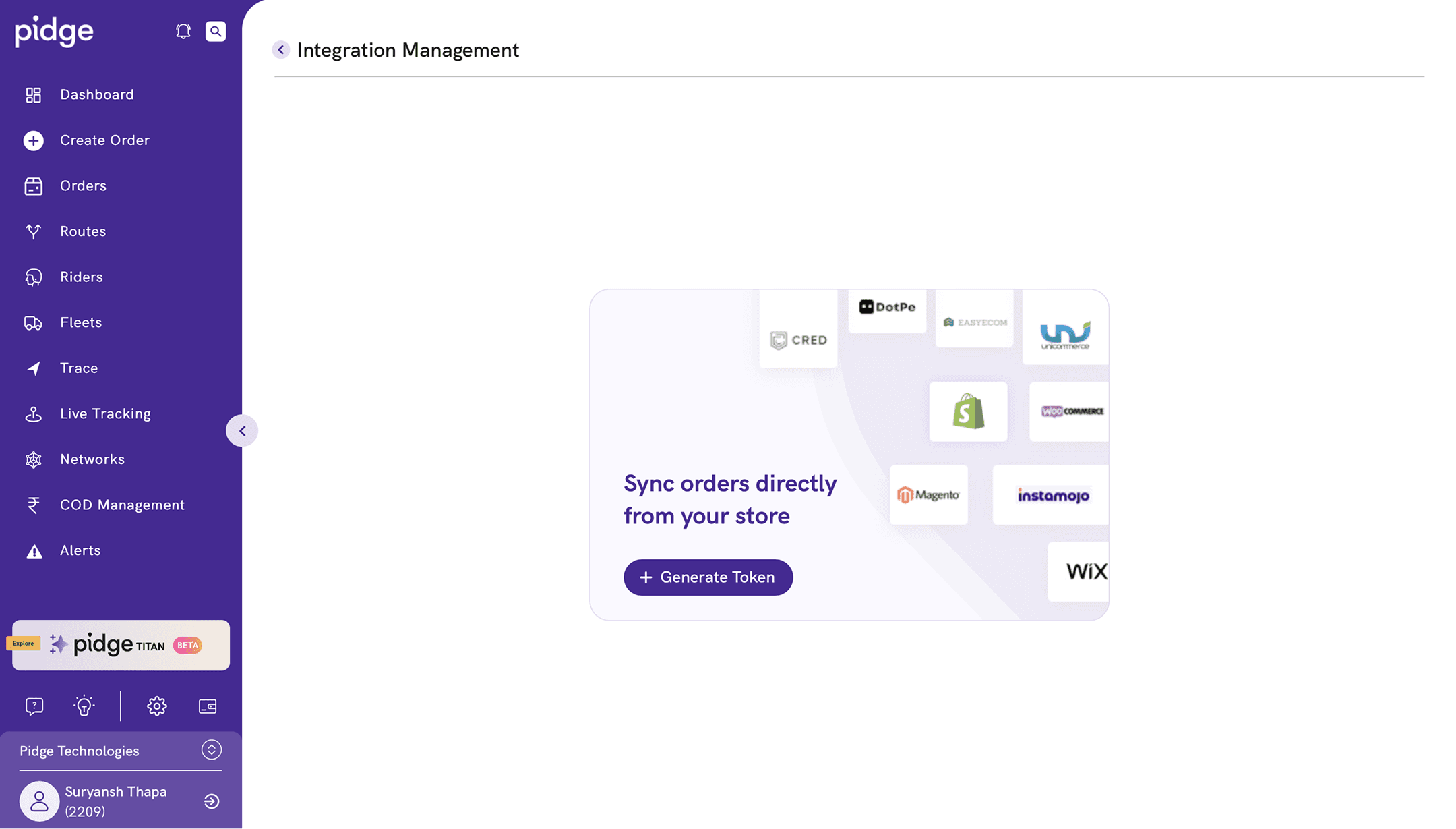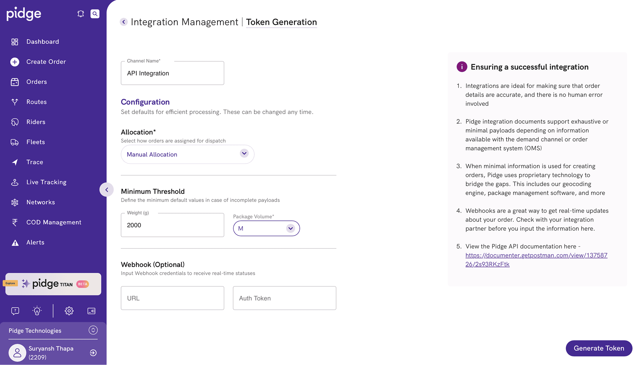 On integration management page, click on Generate Token to start creating an API token.